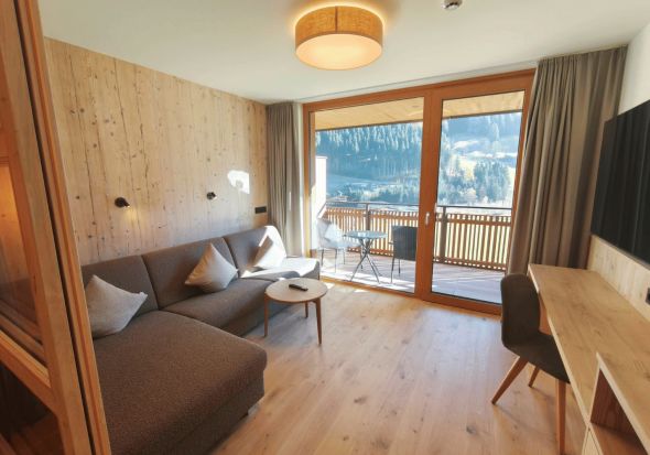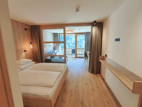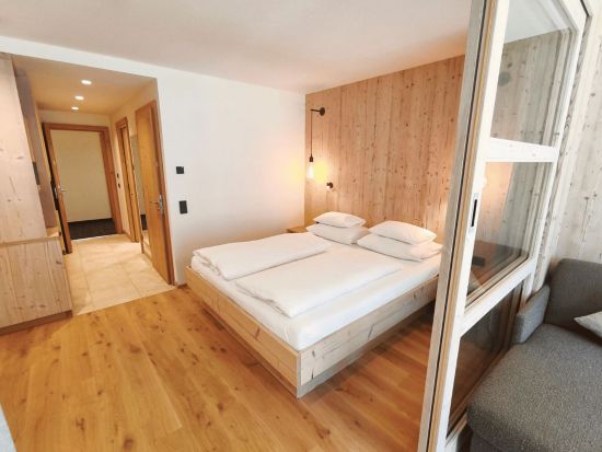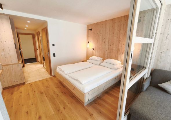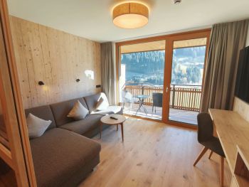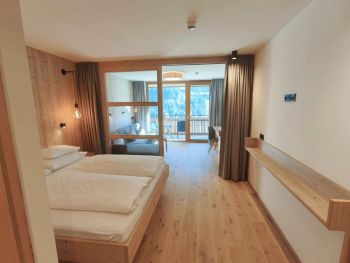 Schönes, geräumiges, helles, lichtdurchflutetes Hotelstudio mit getrenntem Wohnbereich (Schiebetüre), Balkon, Eichenholzboden, Badezimmer mit barrierefreier Dusche, getrenntem WC, Föhn, Schreibtisch, großer TV, Safe, Breitbandinternet, Tiefgaragenplatz und Panoramaglasfront mit Blick in die Berge.