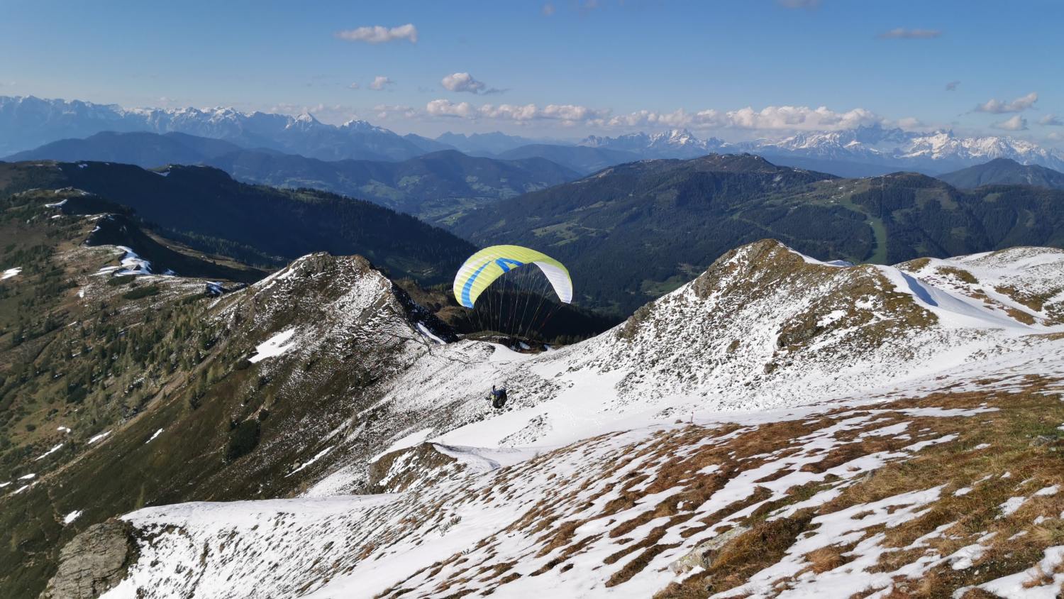 Weiter ging es dann am Kamm entlang zum Gründegg. Dieser Berg ist einfach zu erreichen und bietet eine herrliche Aussicht auf die umliegenden Berge und das Ellmautal. Nach kurzer Rast kam vom Kleinarlertal ein Wanderer mit einem riesigen Rucksack. Wie sich herausstellte hatte er darin seinen Paragleitschirm eingepackt. Wir beobachteten noch den Start und wie er sich davon machte.